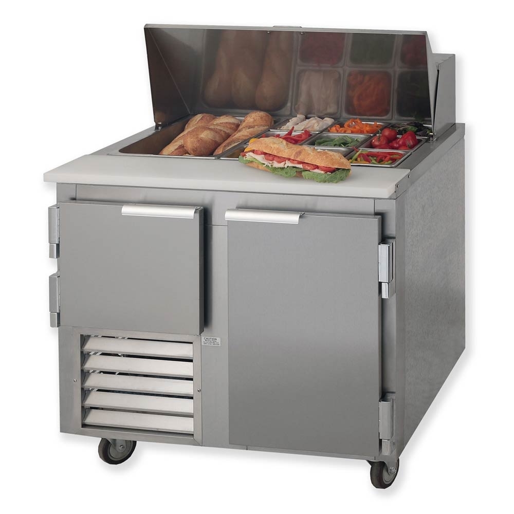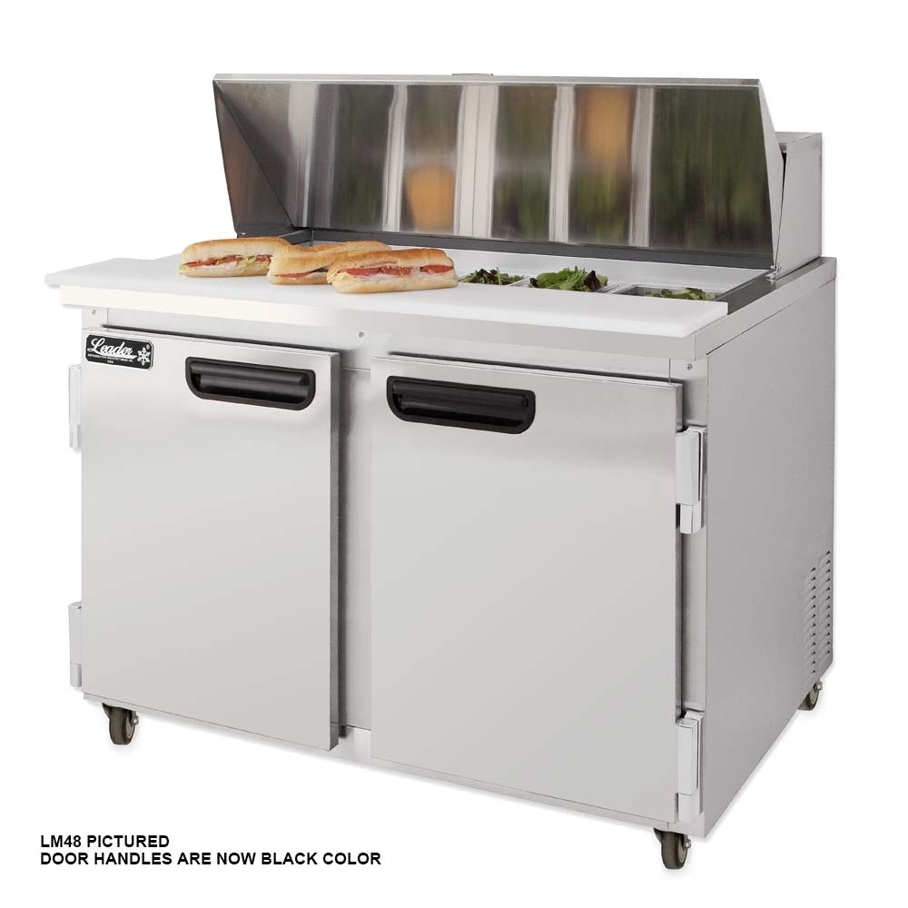Keep your ingredients in one place and increase food prep efficiency in your kitchen with the Leader LM36 commercial sandwich prep table. This model comes with 1 Full & 1 Half swing door, adjustable shelving, and a sturdy stainless steel floor and exterior. Because the LM36 is a 36 inch sandwich prep table with 12.2 cubic feet of space, it is ideal for delis, salad bars, casual restaurants, and cafes. This unit will make it easier for your staff to preserve ingredients at safe serving temperatures