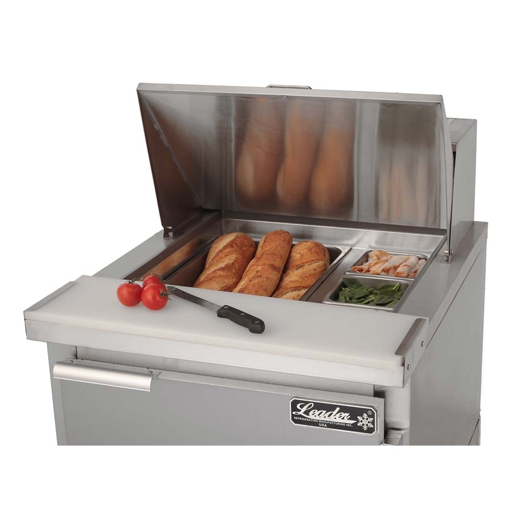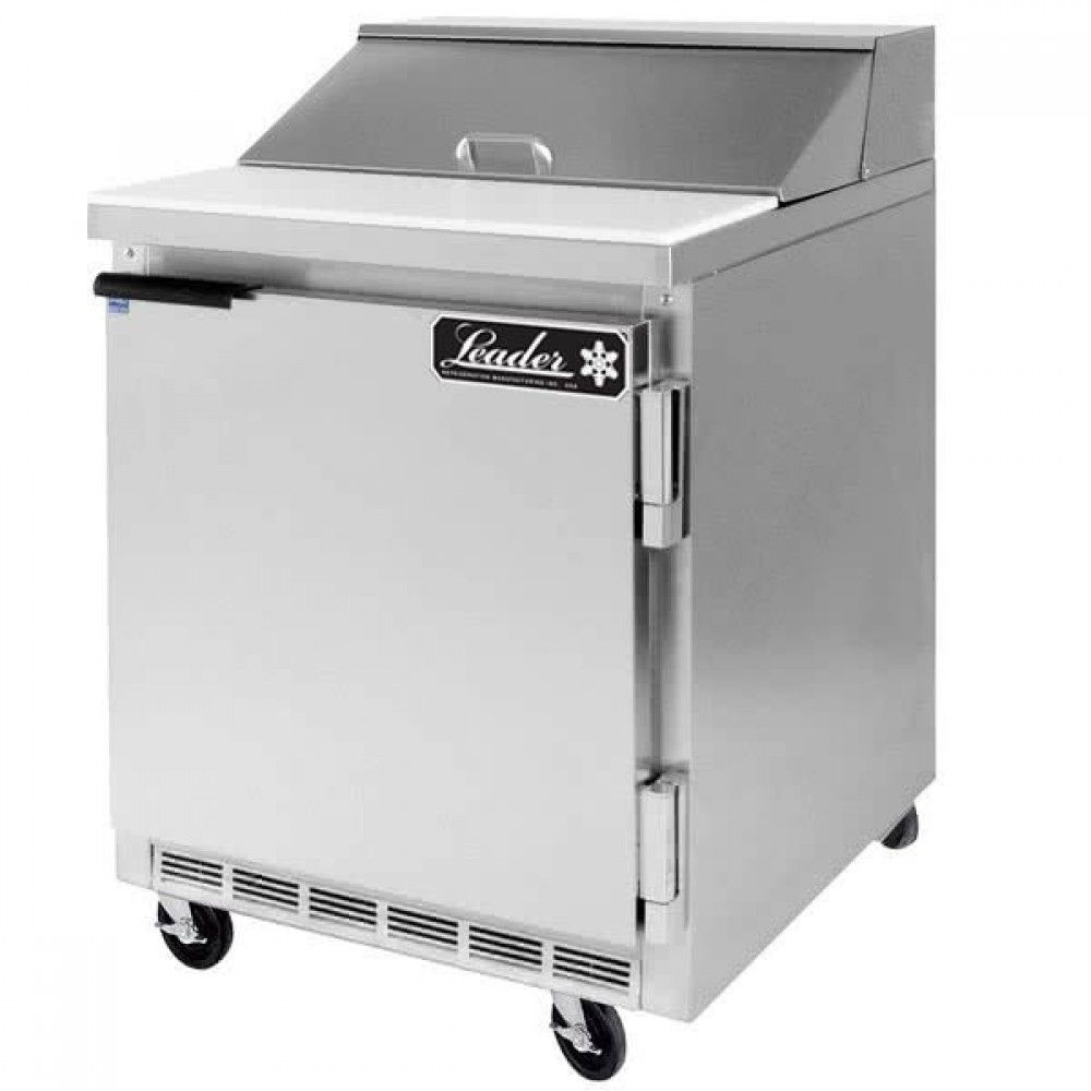 Keep your ingredients in one place and increase food prep efficiency in your kitchen with the Leader ESLM27 commercial sandwich prep table. This model comes with a swing door, adjustable shelving, and a sturdy stainless steel floor and exterior. Because the ESLM27 is a 27 inch sandwich prep table with 7.1 cubic feet of space, it is ideal for low to medium volume delis, salad bars, casual restaurants, and cafes. This unit will make it easier for your staff to preserve ingredients at safe serving temperatures.