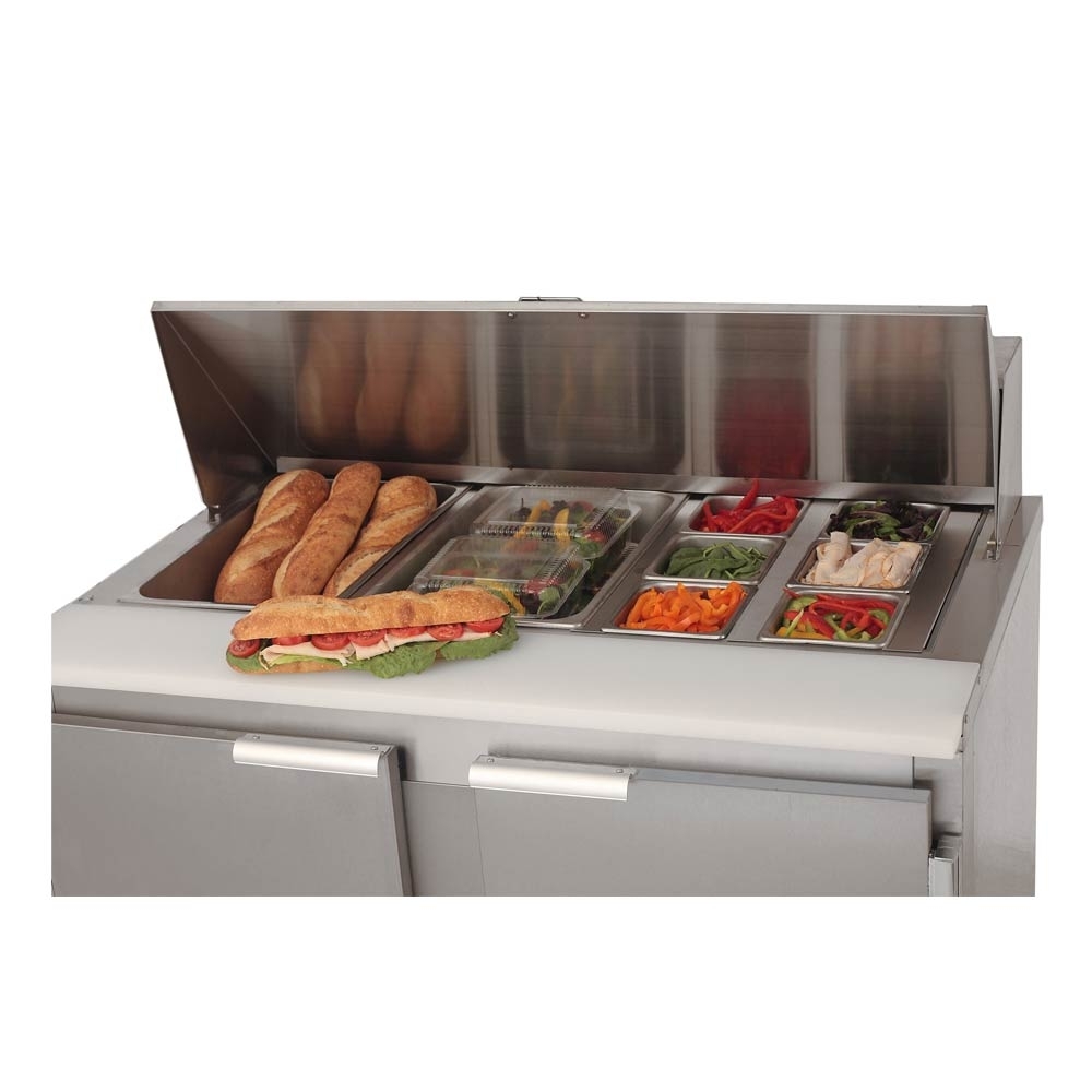 The powerful forced-air refrigeration system holds the storage cabinet at a constant temperature. Evaporator fans and a newly designed louver allows uniform distribution of cold air. The "Isolated Cold Air Compartment" design maintains temperature for each pan to preserve food freshness longer. The isolated compartments keeps pans out the work area to prevent food spillage. "Tecumseh" compressor provides high energy for this units perfect performance.