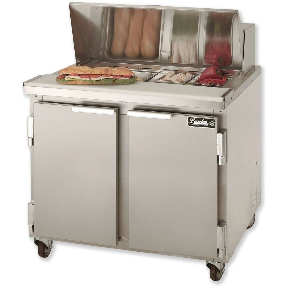 Keep your ingredients in one place and increase food prep efficiency in your kitchen with the Leader ESLM36 commercial sandwich prep table. This model comes with 2 swing doors, adjustable shelving, and a sturdy stainless steel floor and exterior. Because the ESLM36 is a 36 inch sandwich prep table with 9.8 cubic feet of space, it is ideal for delis, salad bars, casual restaurants, and cafes. This unit will make it easier for your staff to preserve ingredients at safe serving temperatures.