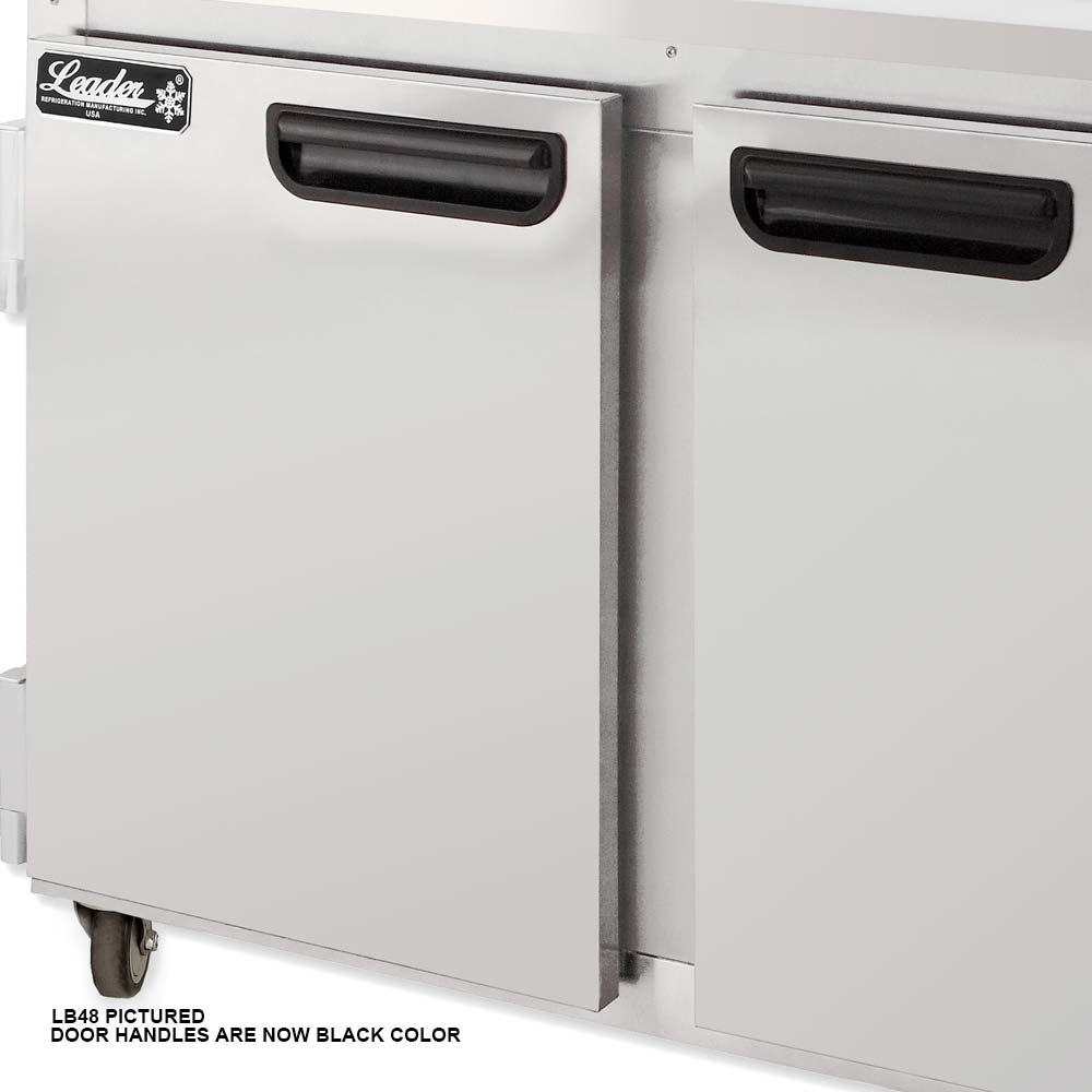 Keep your ingredients in one place and increase food prep efficiency in your kitchen with the Leader LM72 commercial sandwich prep table. This model comes with 2 Full & 1 Half swing doors, adjustable shelving, and a sturdy stainless steel floor and exterior. Because the LM72 is a 72 inch sandwich prep table with 21.2 cubic feet of space, it is ideal for delis, salad bars, casual restaurants, and cafes. This unit will make it easier for your staff to preserve ingredients at safe serving temperatures.